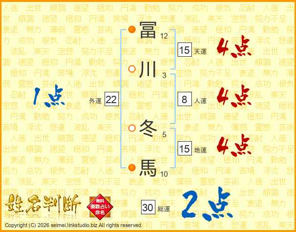 冨(12画)川(3画) 冬(5画)馬(10画)