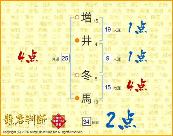 生活面を象徴する運勢です。外部から受ける影響力を表し、結婚運、家庭運や職場、環境への順応性を表します。総運から人運を引いた画数。姓や名が1文字の場合を除く。
