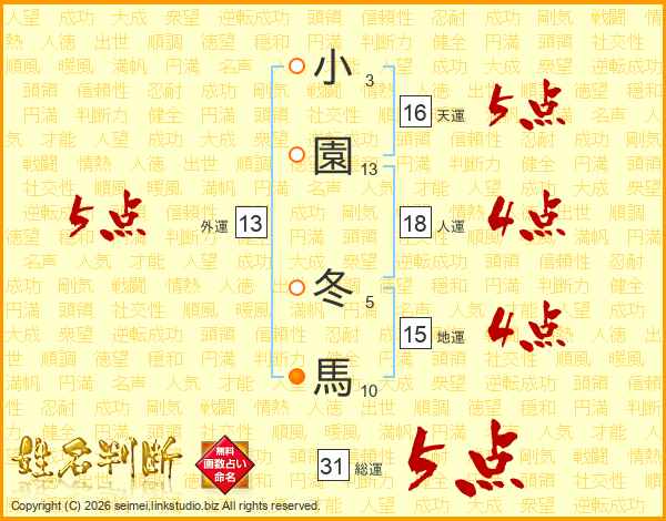 生活面を象徴する運勢です。外部から受ける影響力を表し、結婚運、家庭運や職場、環境への順応性を表します。総運から人運を引いた画数。姓や名が1文字の場合を除く。
