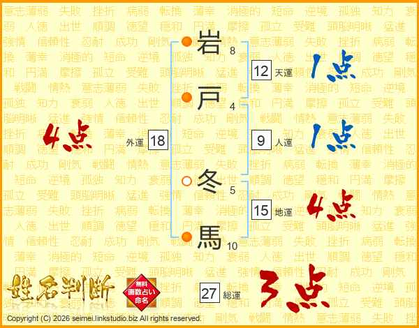 岩(8画)戸(4画) 冬(5画)馬(10画)