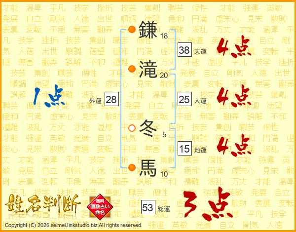 鎌(18画)滝(20画) 冬(5画)馬(10画)