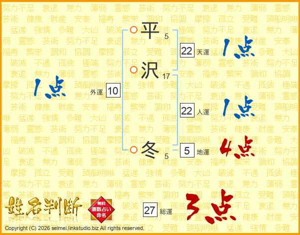 平(5画)沢(17画) 冬(5画)