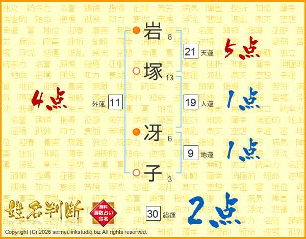 岩(8画)塚(13画) 冴(6画)子(3画)