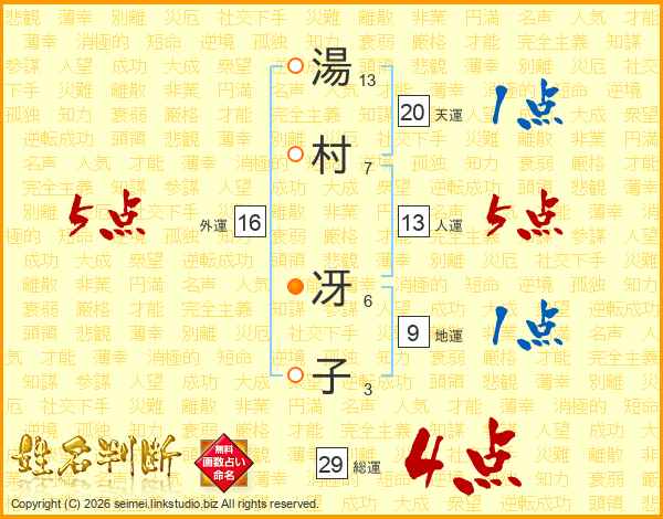 湯(13画)村(7画) 冴(6画)子(3画)