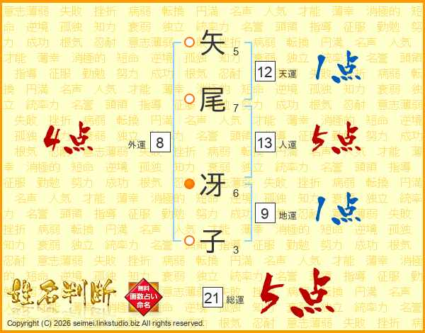矢(5画)尾(7画) 冴(6画)子(3画)