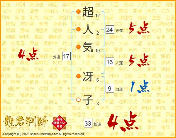 超人気冴子さんの総運は33画の4点!