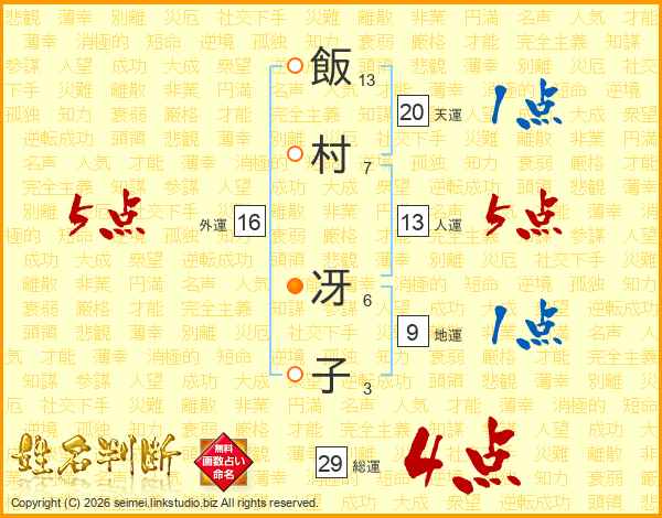 生活面を象徴する運勢です。外部から受ける影響力を表し、結婚運、家庭運や職場、環境への順応性を表します。総運から人運を引いた画数。姓や名が1文字の場合を除く。