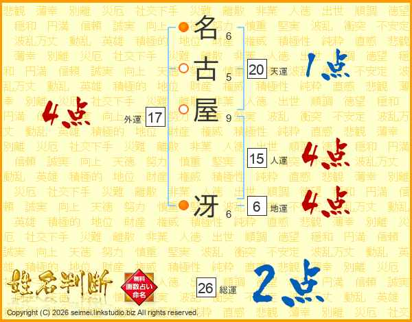 名古屋冴さんの総運は26画の2点!