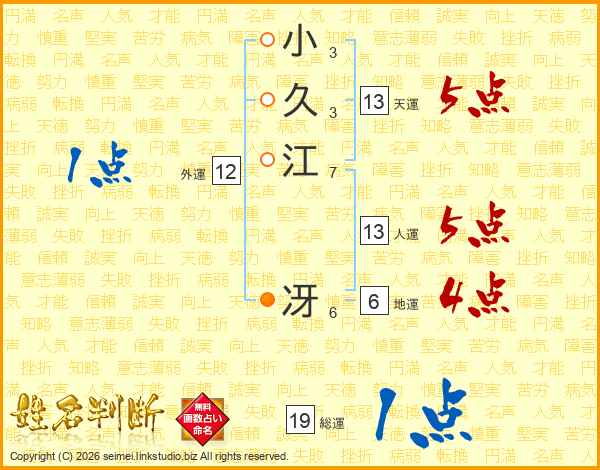 生活面を象徴する運勢です。外部から受ける影響力を表し、結婚運、家庭運や職場、環境への順応性を表します。総運から人運を引いた画数。姓や名が1文字の場合を除く。