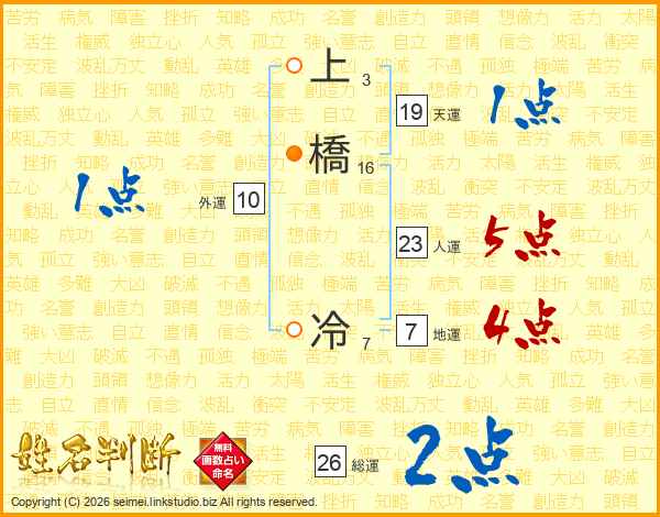 生活面を象徴する運勢です。外部から受ける影響力を表し、結婚運、家庭運や職場、環境への順応性を表します。総運から人運を引いた画数。姓や名が1文字の場合を除く。