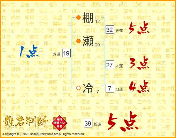 棚瀬冷さんの総運は39画の5点!