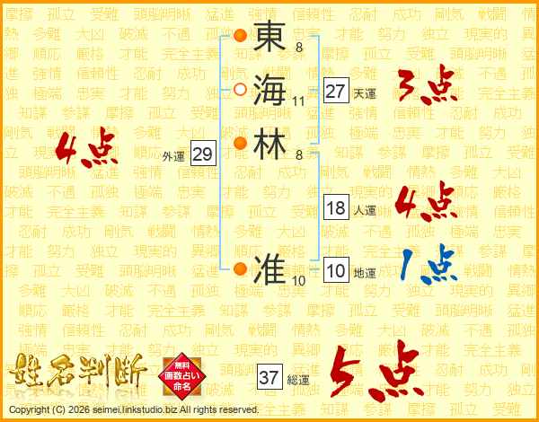 生活面を象徴する運勢です。外部から受ける影響力を表し、結婚運、家庭運や職場、環境への順応性を表します。総運から人運を引いた画数。姓や名が1文字の場合を除く。