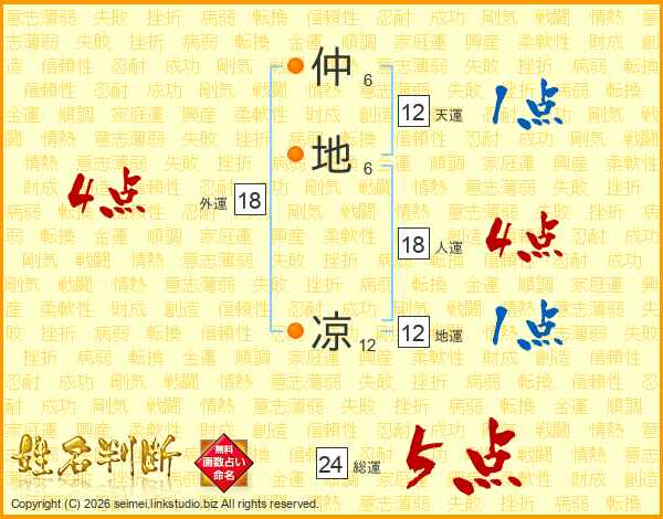 生活面を象徴する運勢です。外部から受ける影響力を表し、結婚運、家庭運や職場、環境への順応性を表します。総運から人運を引いた画数。姓や名が1文字の場合を除く。