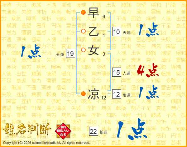 早乙女凉さんの総運は22画の1点!