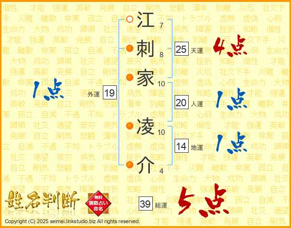 生活面を象徴する運勢です。外部から受ける影響力を表し、結婚運、家庭運や職場、環境への順応性を表します。総運から人運を引いた画数。姓や名が1文字の場合を除く。