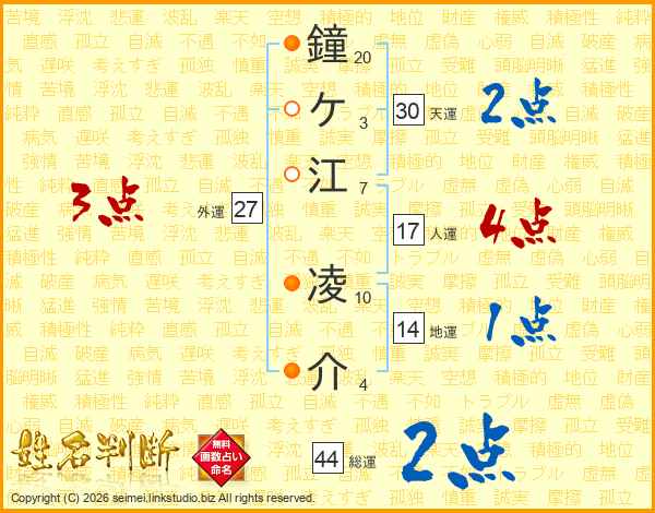 鐘ケ江凌介さんの総運は44画の2点!