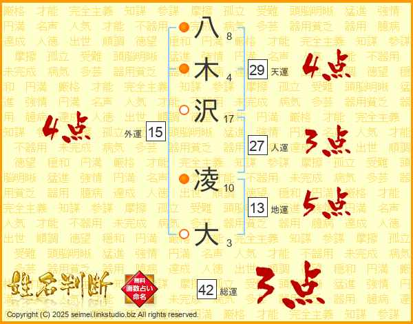 八(8画)木(4画)沢(17画) 凌(10画)大(3画)