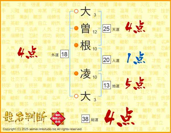 大(3画)曽(12画)根(10画) 凌(10画)大(3画)