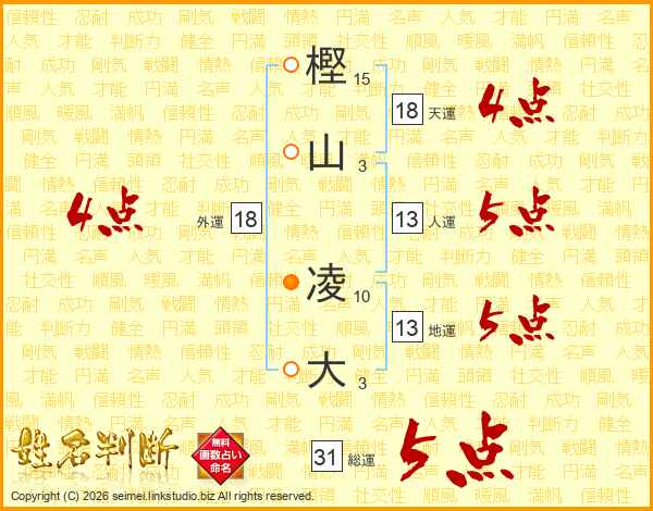 樫(15画)山(3画) 凌(10画)大(3画)