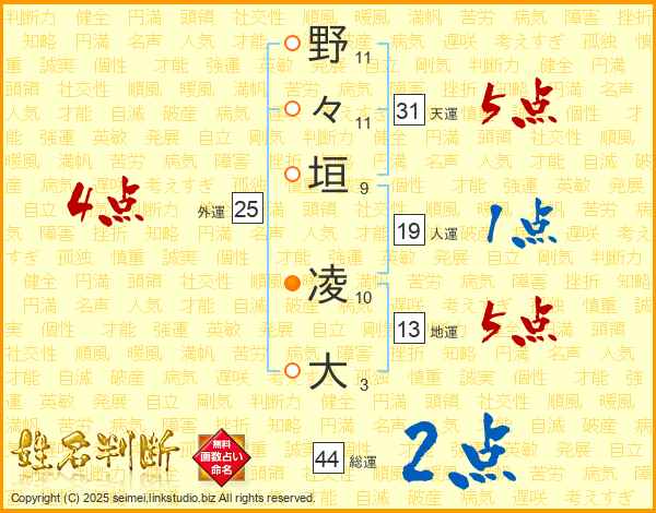 野(11画)々(11画)垣(9画) 凌(10画)大(3画)