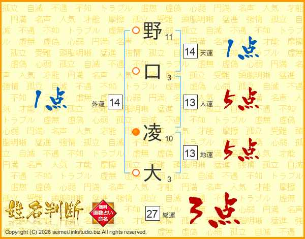 生活面を象徴する運勢です。外部から受ける影響力を表し、結婚運、家庭運や職場、環境への順応性を表します。総運から人運を引いた画数。姓や名が1文字の場合を除く。