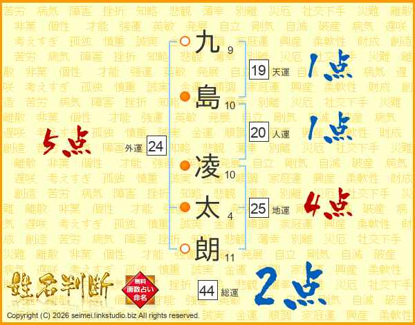 九(9画)島(10画) 凌(10画)太(4画)朗(11画)