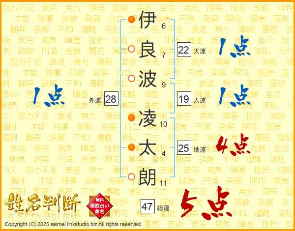 伊(6画)良(7画)波(9画) 凌(10画)太(4画)朗(11画)
