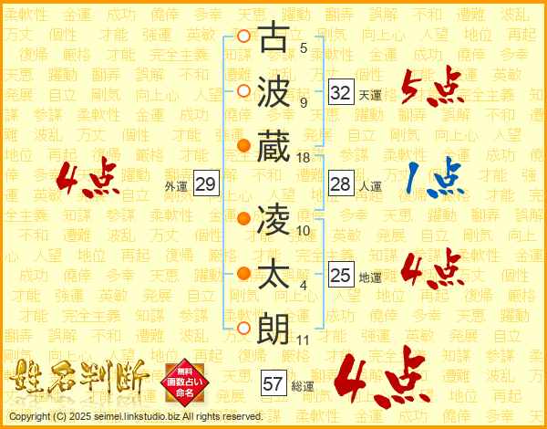 古(5画)波(9画)蔵(18画) 凌(10画)太(4画)朗(11画)
