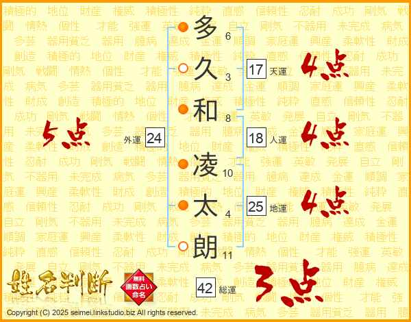 多(6画)久(3画)和(8画) 凌(10画)太(4画)朗(11画)