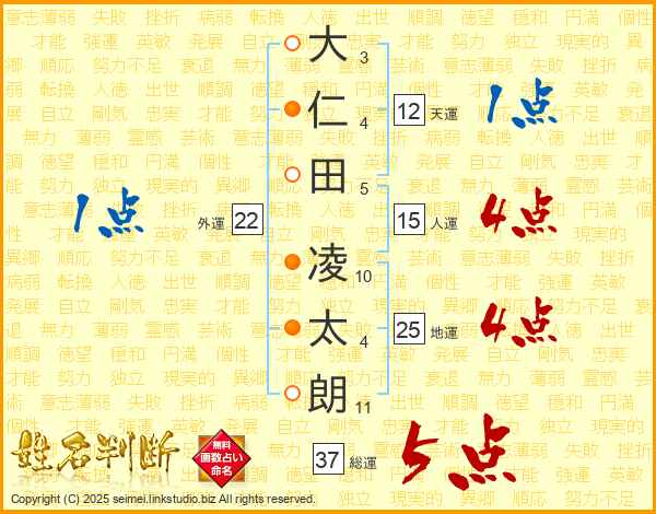 大(3画)仁(4画)田(5画) 凌(10画)太(4画)朗(11画)