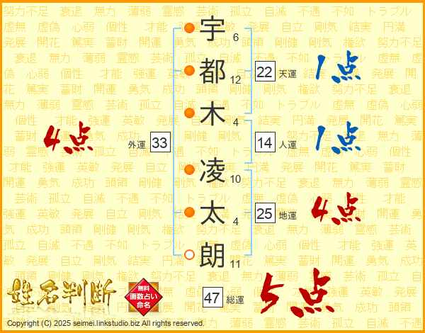 宇(6画)都(12画)木(4画) 凌(10画)太(4画)朗(11画)