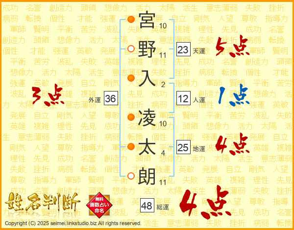 宮(10画)野(11画)入(2画) 凌(10画)太(4画)朗(11画)