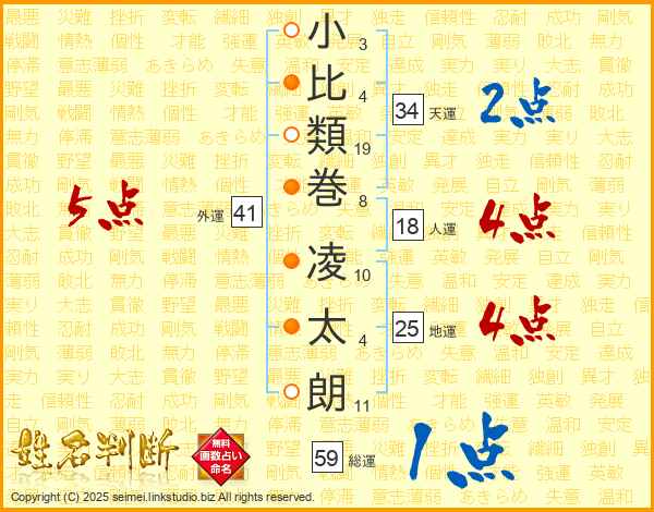 小(3画)比(4画)類(19画)巻(8画) 凌(10画)太(4画)朗(11画)