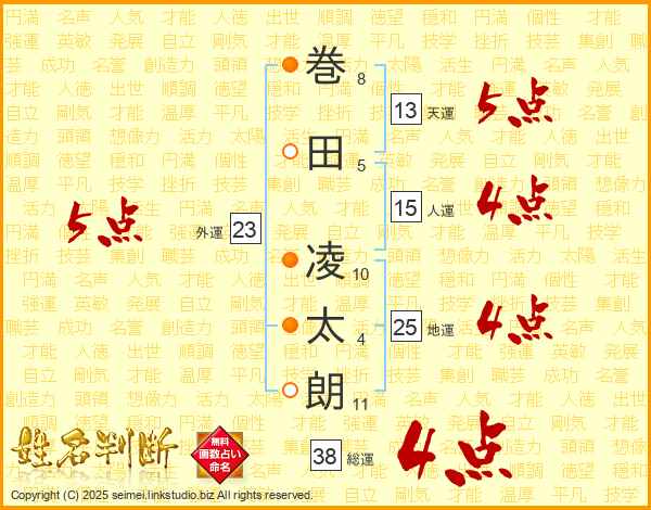 巻(8画)田(5画) 凌(10画)太(4画)朗(11画)