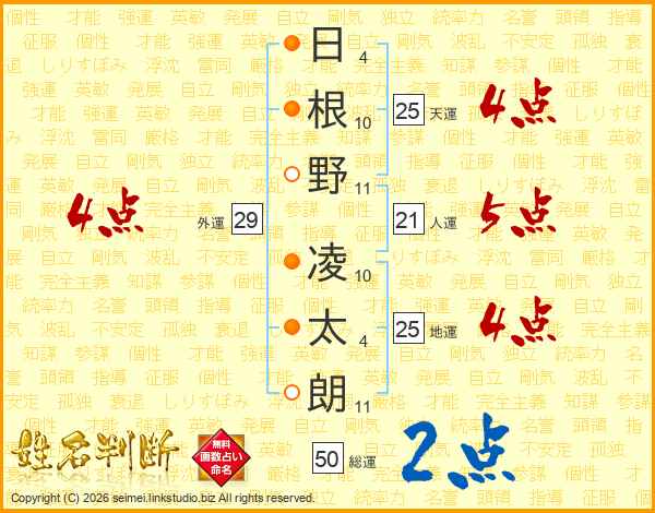 日(4画)根(10画)野(11画) 凌(10画)太(4画)朗(11画)