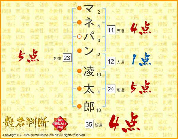 マ(2画)ネ(4画)パ(3画)ン(2画) 凌(10画)太(4画)郎(10画)