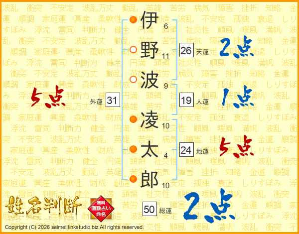 伊(6画)野(11画)波(9画) 凌(10画)太(4画)郎(10画)