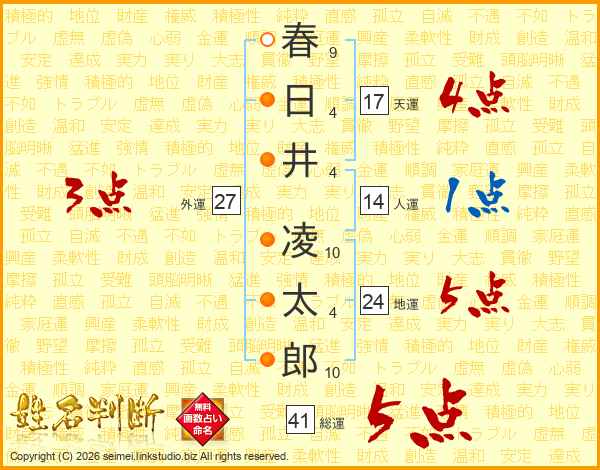 春(9画)日(4画)井(4画) 凌(10画)太(4画)郎(10画)