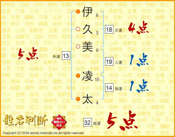 伊(6画)久(3画)美(9画) 凌(10画)太(4画)