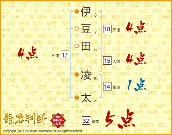 伊(6画)豆(7画)田(5画) 凌(10画)太(4画)