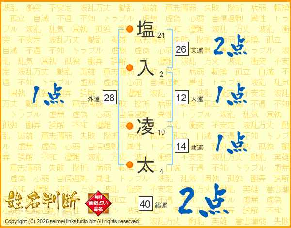 塩(24画)入(2画) 凌(10画)太(4画)