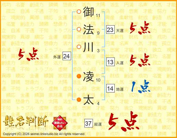 御(11画)法(9画)川(3画) 凌(10画)太(4画)