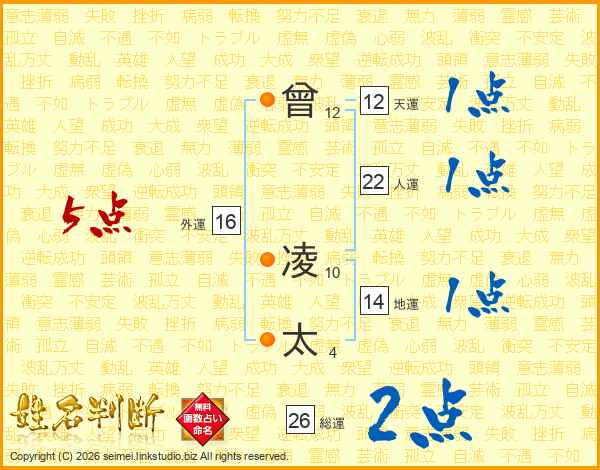 曾(12画) 凌(10画)太(4画)