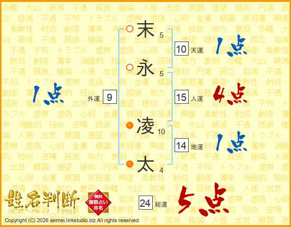 生活面を象徴する運勢です。外部から受ける影響力を表し、結婚運、家庭運や職場、環境への順応性を表します。総運から人運を引いた画数。姓や名が1文字の場合を除く。