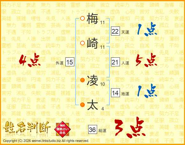 梅(11画)崎(11画) 凌(10画)太(4画)