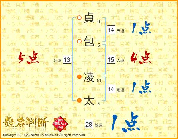 生活面を象徴する運勢です。外部から受ける影響力を表し、結婚運、家庭運や職場、環境への順応性を表します。総運から人運を引いた画数。姓や名が1文字の場合を除く。
