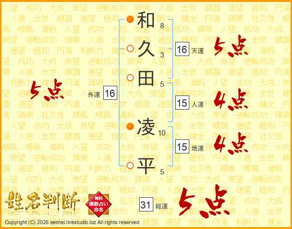 和(8画)久(3画)田(5画) 凌(10画)平(5画)