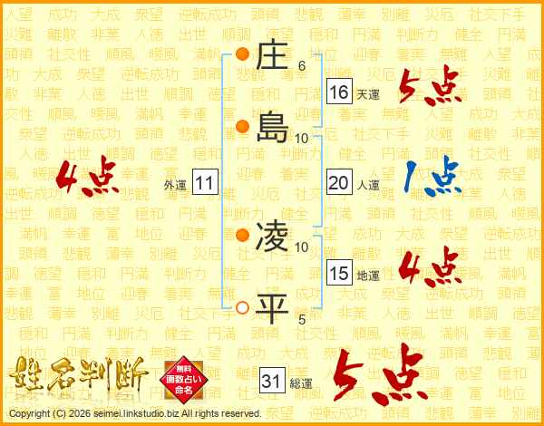 庄(6画)島(10画) 凌(10画)平(5画)