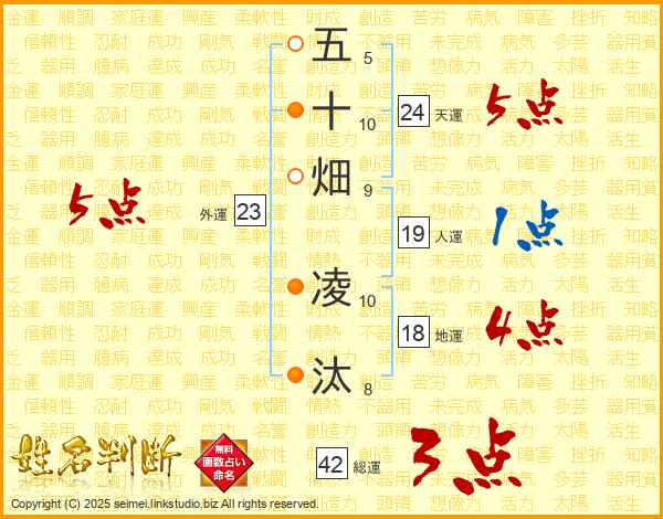 五(5画)十(10画)畑(9画) 凌(10画)汰(8画)
