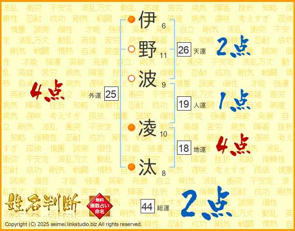 伊(6画)野(11画)波(9画) 凌(10画)汰(8画)